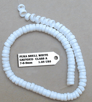 | World-known Class A Natural Puka Shell White cut into fine and attractive beads "as it is" (no grinding applied). 7 - 9 mm in diameter US$ 0.80 / necklace |